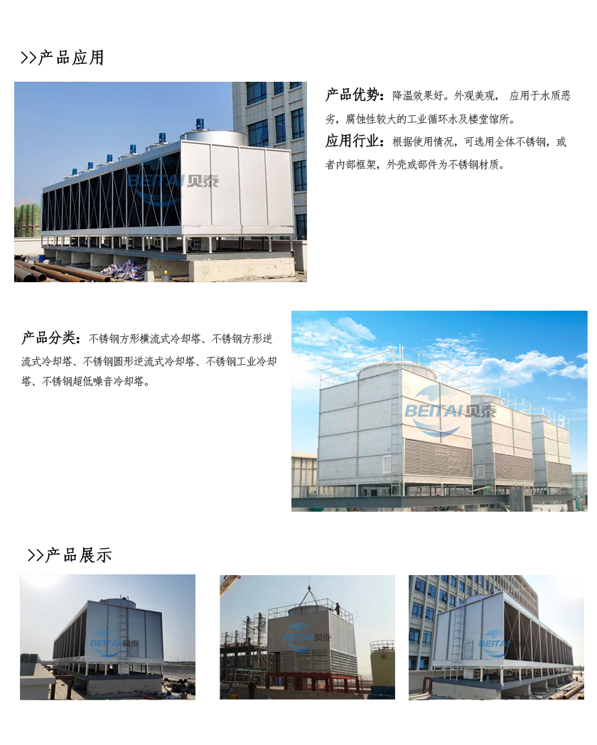 不銹鋼方型冷卻塔是根據(jù)產(chǎn)品的使用特點,揉合國外的熱交換技術(shù)與工藝生產(chǎn)科學(xué)管理,獨創(chuàng)于熱交換技術(shù)的冷卻塔.它具有重量輕、體積小、效率高、能耗低、便維修等一系列比使用常規(guī)冷卻塔佳的特點。
